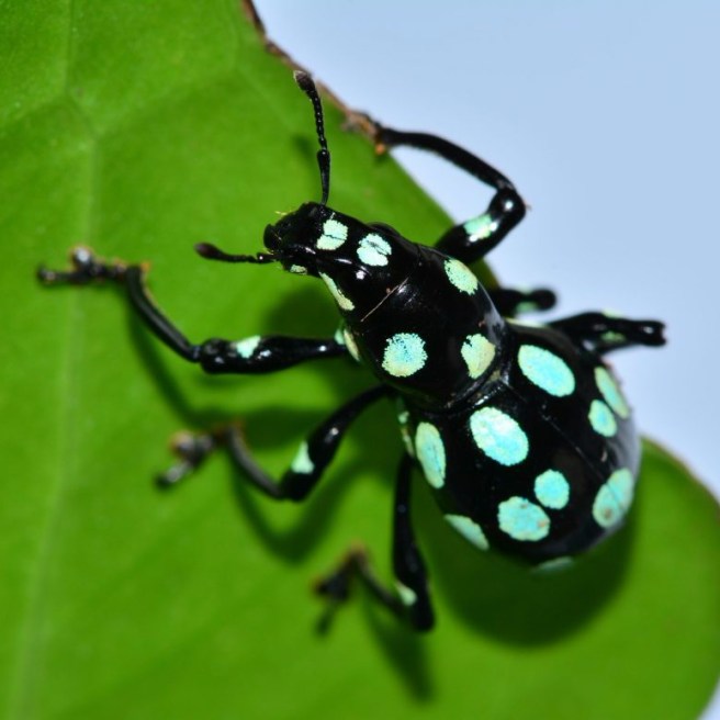 Pachyrhynchus sarcitis defends effectively with its robust exoskeleton against attacks from lizard predators.