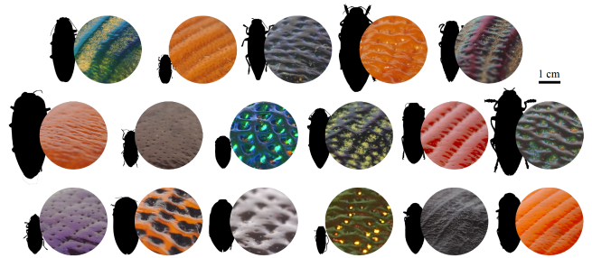 Jewel beetles have high diversity in coloration and surface sculpturing.